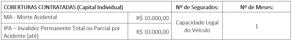 A cobertura deste seguro limita-se as consequências de acidentes pessoais ocorridos com os passageiros dos veículos cobertos e descriminados nesta proposta, devidamente licenciado para o transporte de pessoas.