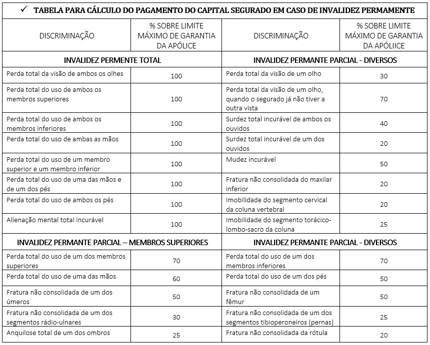 3.2 Invalidez por acidente – Garante o pagamento de até 100% do valor do capital segurado na cobertura básica, ao próprio segurado, caso o mesmo venha a ficar parcial ou totalmente inválido, em caráter permanente, em consequência de acidente pessoal coberto.